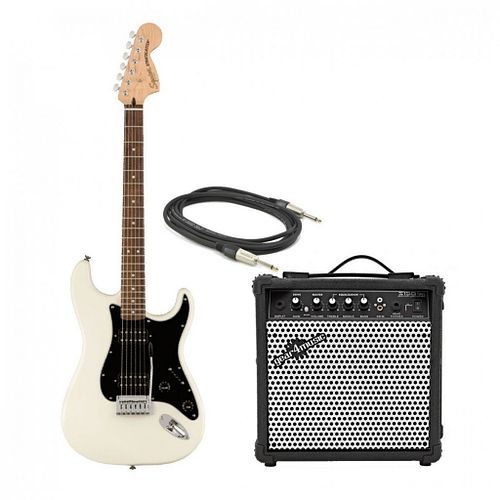 La Squier Stratocaster Affinity HH, Olympic White et son pack avec ampli de 15 W est le fruit d'un savoureux mélange entre un design classique et une jouabilité intuitive adaptée aux guitaristes en herbe.